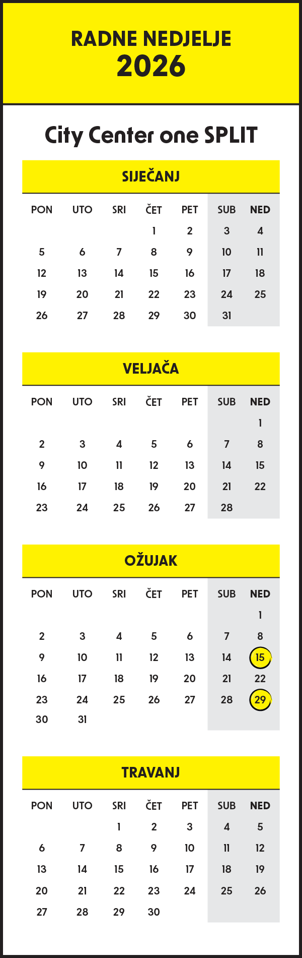 U nastavku pogledajte kojim ćete nedjeljama uživati u shoppingu u City Centeru one i tako na vrijeme isplanirajte svoje vikende. Žuto označene nedjelje u kalendaru su radne nedjelje.