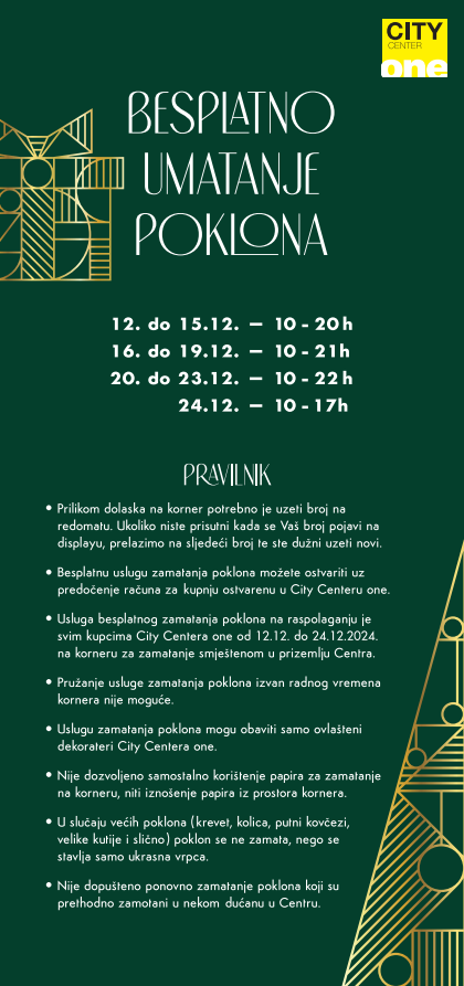 Pokloni koje ćete darovati svojim najdražima neka se istaknu kao najljepše dekorirani – za to će se pobrinuti vješte, maštovite i kreativne aranžerke u City Centeru one koje će svaki poklon kupljen u Centru besplatno omotati i dekorirati od 12. do 24. prosinca. A što se tiče odabira poklona – na raspolaganju vam su vam brojne trgovine u kojima ćete pronaći izvrstan poklon po svačijoj mjeri!