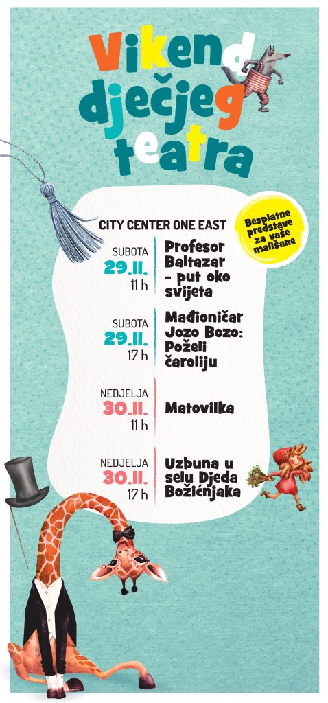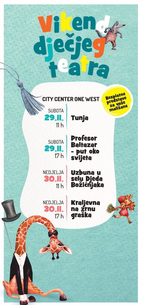At the same time, at City Center One West on Saturday, November 29 at 11 AM, you can watch Tunja, and at 5 PM Professor Baltazar – Around the World. On Sunday, November 30 at 11 AM, enjoy Alarm in Santa’s Village, while at 5 PM the play The Princess and the Pea will be performed.