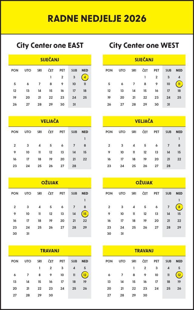 U nastavku provjerite radno vrijeme vašeg City Centera one East te informacije o radnim nedjeljama.