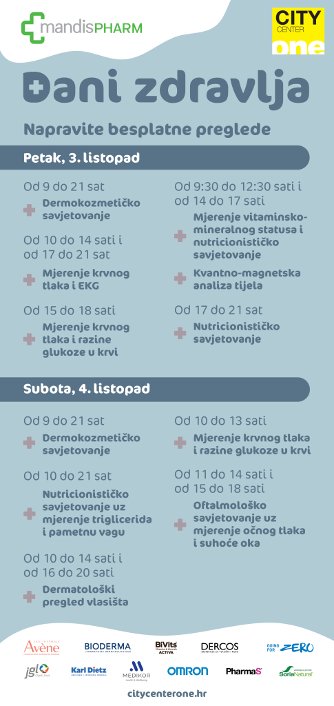 Iako često na to zaboravljamo – vlastito zdravlje i zdravlje naših najbližih trebalo bi nam biti na prvom mjestu. Stoga je City Center one West, u suradnji s Mandis Pharmom, za vas pripremio niz besplatnih pregleda i savjetovanja sa stručnjacima koji će biti izvrsna polazišna točka u utvrđivanju općeg stanja vašeg organizma.